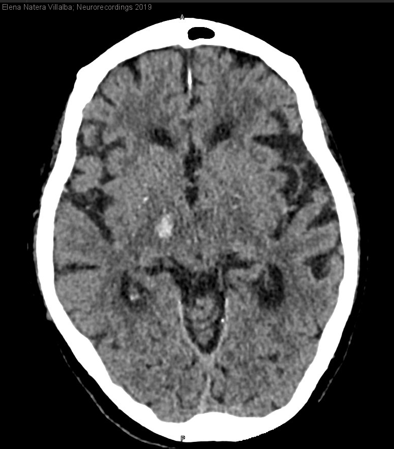 Diagnóstico final: Hemicorea izquierdo de inicio agudo secundaria a hematoma talámico derecho de probable etiología hipertensiva