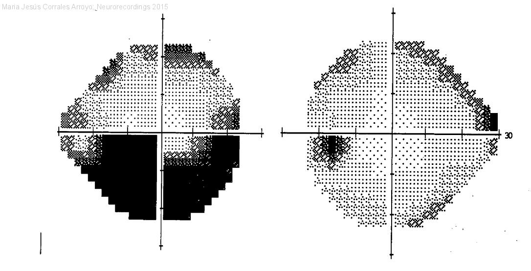 Varón de 48 años. No factores de riesgo vascular salvo fumador social . No precisa tratamiento. Refiere pérdida de visión brusca en campos inferiores de ojo derecho, sin cambios desde el inicio. La exploración es normal,...