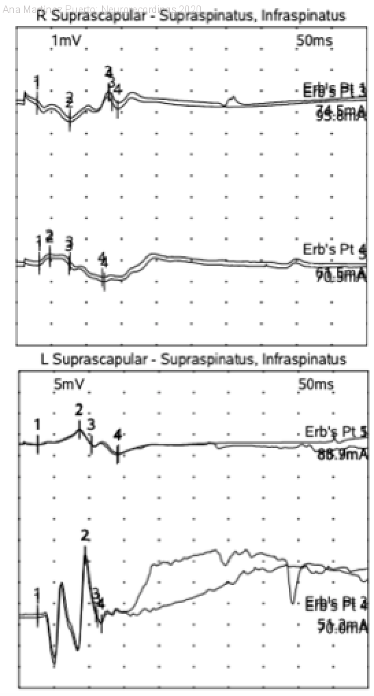 Paciente remitido a la consulta de neurofisiología para valoración de atrapamiento de nervio supraescapular derecho. Presenta, desde hace 2 años, omalgia derecha, debilidad en la rotación externa del brazo derecho (con el brazo flexionado) y...