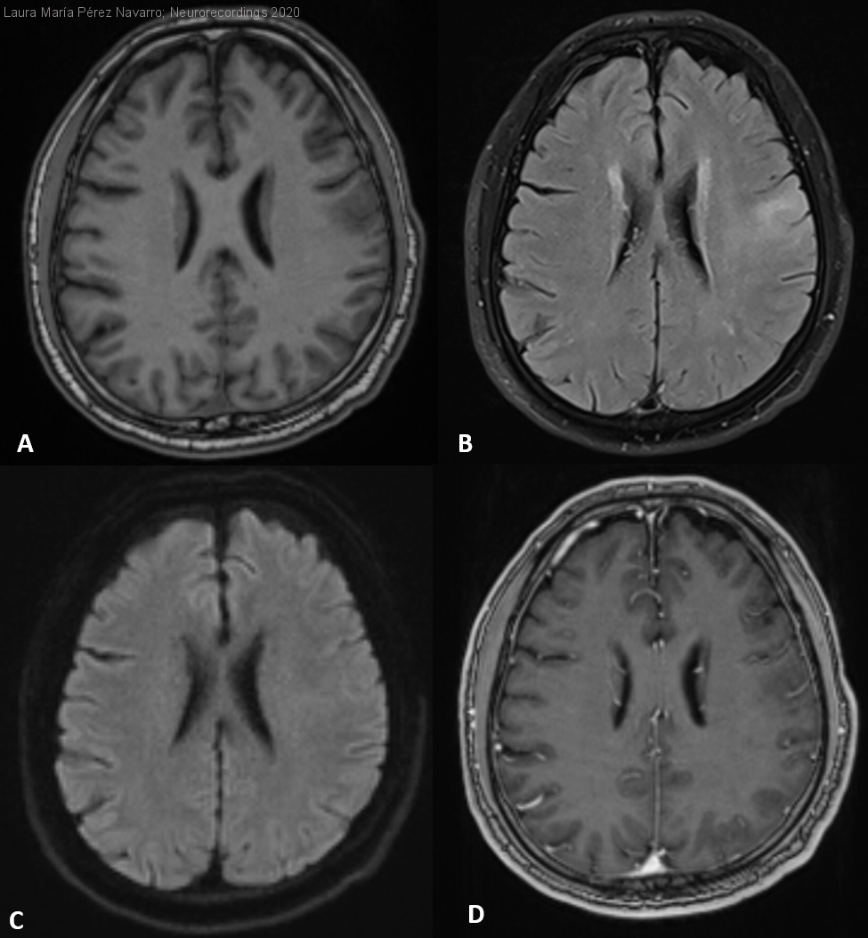 Exploración: afasia motora, parálisis facial central derecha y mioclonías...